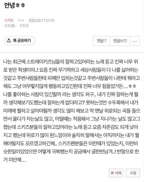 댓글 적어준거 하나하나씩 천천히 읽어봤는데 너무 고마워.. 아무한테도 말 못하고 있었는데 여기에라도 털어놔서 살짝 개운한느낌이야!ㅎㅎ 예쁜말해줘서 너무너무 고마워ㅜㅜ 이번에 컴백하는걸로 알고있는데 이번에 노래 나오면 나도 많이 들을게! 스키즈분들 노래 대충 다 들어봤는데 들은것마다 내스탈이더라구! 암튼 너무너무 고마워ㅠㅠㅠㅜ