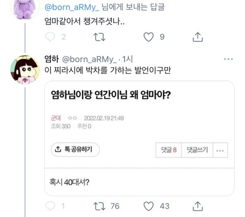 우리가 넴드분들한테 엄마라고 칭하니까 염하님 40대냐고 물어보는 글 올라왔었는데 그거 알고 계셨나봨ㅋㅋㅋㅋㅋㅋ