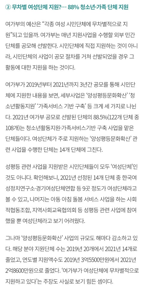 3. 여가부는 여성단체에 무차별 지원하지 않음. 가족, 청소년 단체에 대부분을 지원하며 단체에 보조금을 주는게 아니라 아동,가족,청소년,성평등에 도움이 되는 '사업'에 지원함.