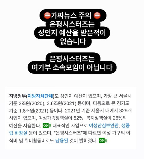 4. 얼마전 판에 여가부에서 '은평시스터즈'라는 곳이 지원금을 받는다고 올라왔는데 이것도 가짜뉴스. 여가부가 아닌 서울시의 청년들의 각종 모임을 지원하는 청년허브에서 지원받은것.