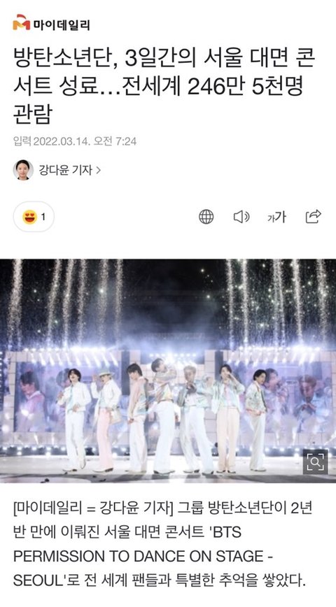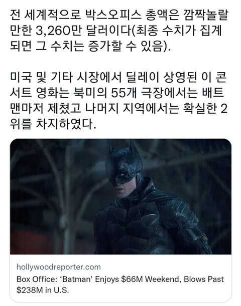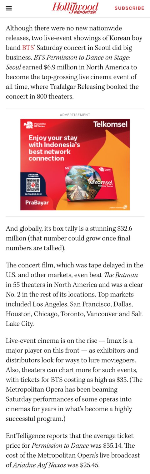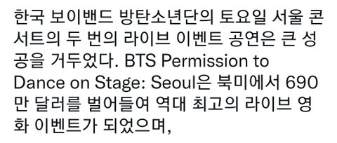 방탄소년단의 '퍼미션 투 댄스 온 스테이지 : 서울'은 박스오피스 집계 상 북미에서 역대 최고 수익의 라이브 시네마가 됨.