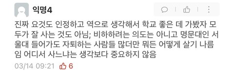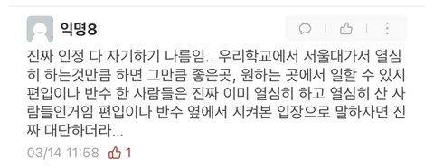 맨날 에타에 지잡 이러는애들때문에 핫게시판에 지잡 이러지말자 이런글 올라오거든? 근데 거기까지는 그렇다쳐도 댓글이 ㅈㄴ웃겨 무슨 서연고애들이 말하는것도 아니고 지들 수준이 이런데 어차피 좋은 대학가도 의미없다 ㅇㅈㄹ 개빡친다 진짜 편입성공하고 말지 내가