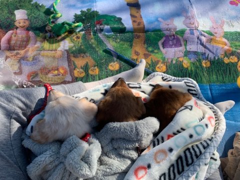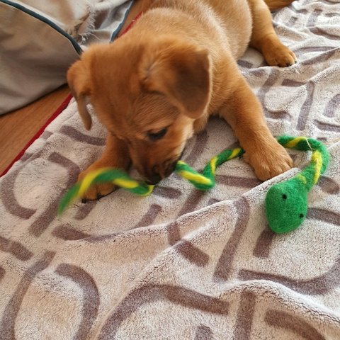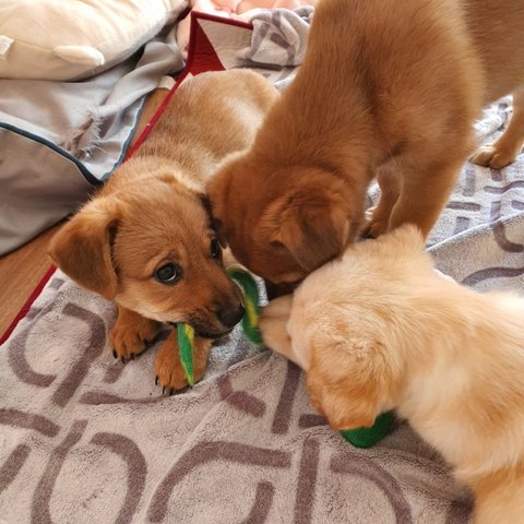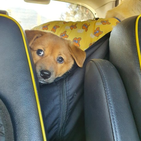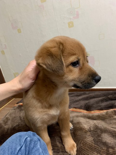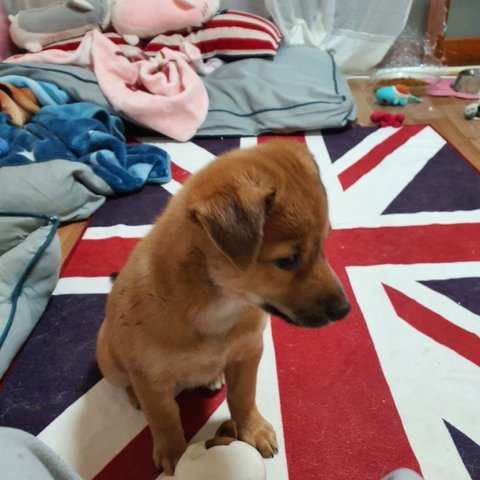 빨강 - 남아, 황구, 다리가 짧아요. 털이 복슬해지고 있어요. 배를 잘 까요.