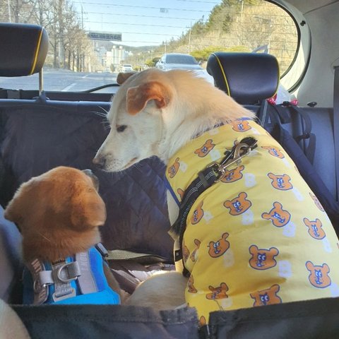 뒷좌석 반려동물카시트하고 엄마랑 같이 옹기종기 탔는데