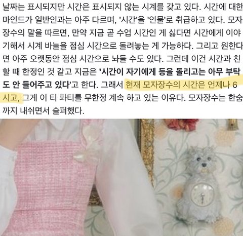 현실세계와 이상한 나라를 연결해주는 역할= 시계토끼같음(앨리스가 이상한 나라에 들어오게 해주는 계기)