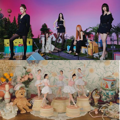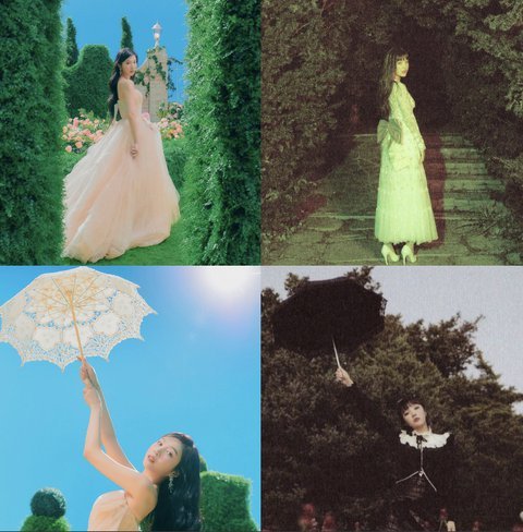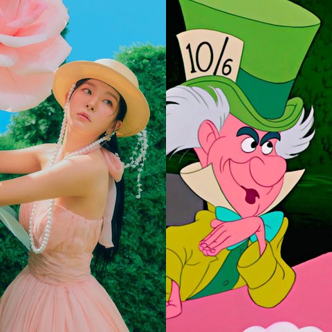 흰색 베레모는 슬기, 분홍 머리는 예리, 붉은 상의는 아이린, 노란 머리는 웬디이므로 여기서 앨리스는 조이.