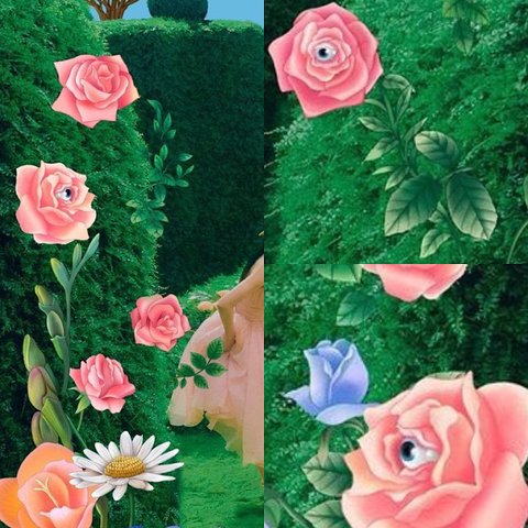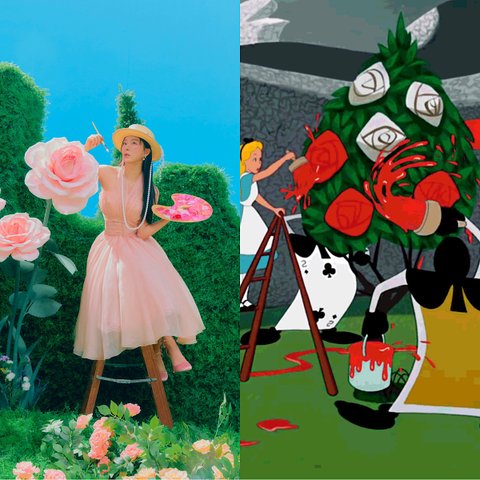 꽃을 칠하는 슬기, 이상한 나라의 앨리스에서 병정들과 앨리스가 장미를 칠하는 모습이 연상됨