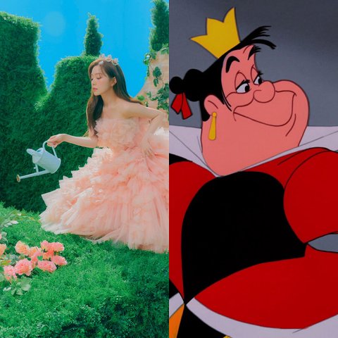 아이린은 혼자서 왕관을 쓰고있고, 다른 멤버들과 비교했을때 눈에 띄게 화려한 드레스를 입고 있음= 하트 여왕