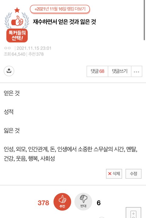 잃은것보다 얻은게 너무 큰데?ㅋㅋㅋ 진짜 멋있다 잃었다고 느끼는 것조차 대학생활하면서 되찾겠다 진짜 너무 축하해 매일매일이 즐거운 대학생활하기를 바랄게