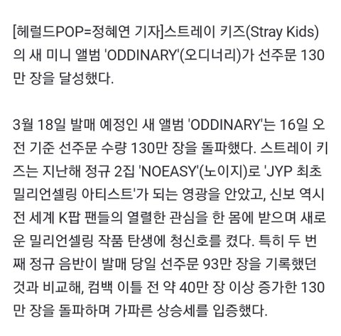 스트레이 키즈, 새 앨범 '오디너리' 선주문 130만장 달성.."거침없는 상승세" ❤️❤️❤️❤️