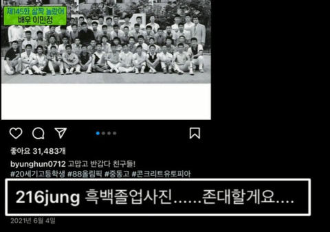 '흑백 졸업사진. 존대할게요'라고 댓글 남긴 이민정