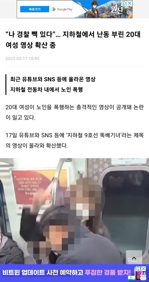저 여자는 술 취했음.. 근데 ㅄ같은 인성과 술의 콜라보로 인해 지하철 바닥에 침을 수차례나 뱉는 막장 짓을 저질렀는데, 그걸 보고 저 아저씨는 그러지 말라고 정당하게 훈계식으로 나섰음.. 근데 상상 이상으로 ㅄ인 저 여자는 핸드폰으로 아저씨 머리를 찍어 버리며 특수 폭행을 가한 것