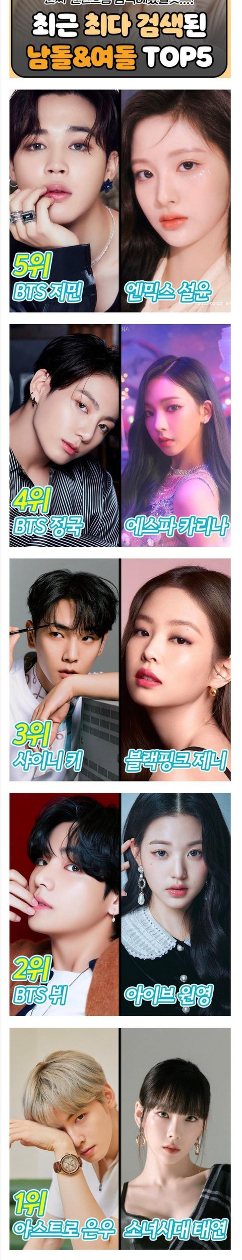 여자아이돌 1위 소녀시대 태연 2위 아이브 장원영 3위 블랙핑크 제니4위 에스파 카리나5위 엔믹스 설윤