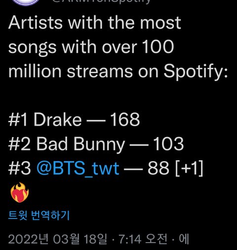 너툽얘기에 뜬금없지만 스포ㅌㅍㅇ1억 스밍 넘긴 곡이 88개 이건 통털어 세번째임