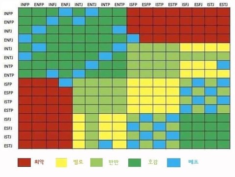 istp 나옴 진짜 예상했던 그대로다ㅋㅋㅋㅋㅋ 오빠가 엔프핀데 아빠랑 사이 ㅈㄴ 안 좋단말임? 근데 궁합표 보니까 둘 궁합 최악이네ㅋㅋㅋㅋㅋㅋ 엄마도 궁금하다