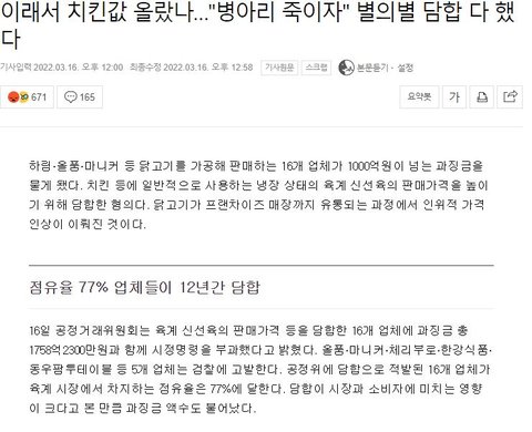 담합은 엄연한 불법이지만 이왕 할거면 양계 농가한테 부화시키지 말고 계란 상태로 두라고 하던가 그럼 가격 담합 들킬까봐 농가에서 힘들게 부화시켜서 보낸 병아리들을 말도 안 하고 산 채로 갈아버려서 죽이고 ㅎ 정말 무슨 자본주의 비판하는 블랙 코미디 영화에 나올 법한 악당짓을 자처하네요 현실판 옥자네요