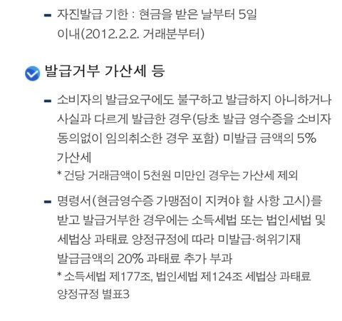 일반소비자를 상대로 하는 업종은 소비자가 현금영수증을 요구할 경우에(1원 이상) 무조건 발급해야함. 발급 거부나 상이한 금액으로 발급시엔 미발급 금액의5%가산세 또는 20%과태료까지 추가 부과 될 수 있음