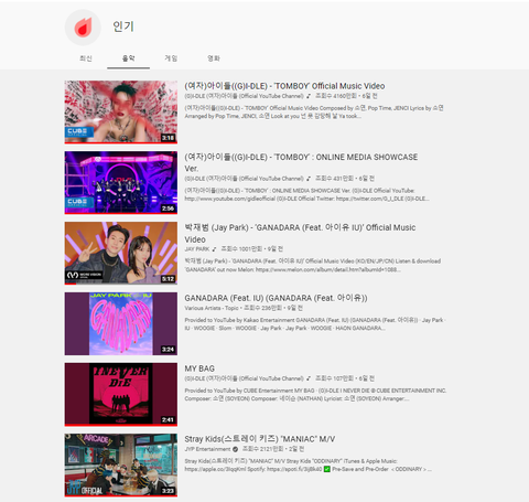 유튜브 한국 '인기급상승 순위' 5위 안에 여자아이들(IDLE) 영상이 3개 나 있다