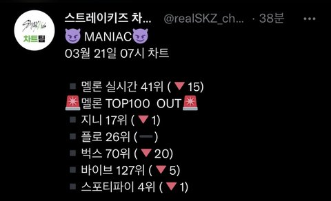 오늘부터 또 신곡 나오면 차트인 영영 힘들 수도 있어