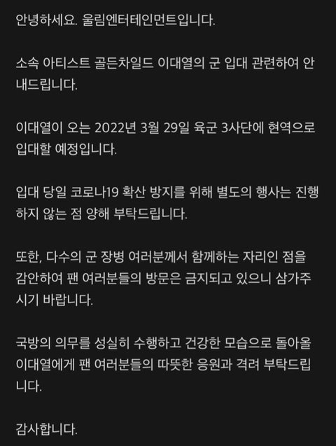 대열이 3/29 입대