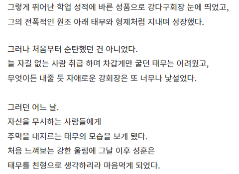 초딩 즈음에 강다구(태무 할아버지)가 데려와서 태무와 성훈이 형제처럼 지냄.