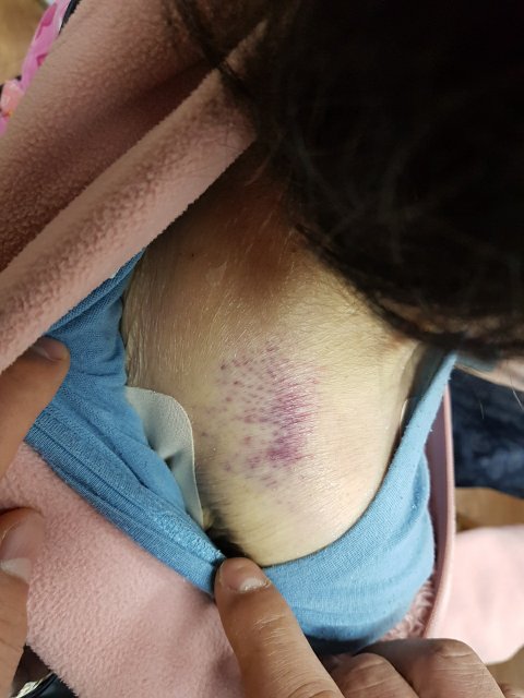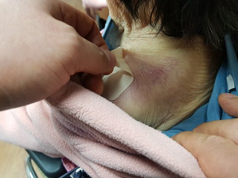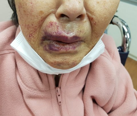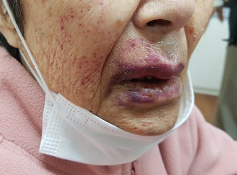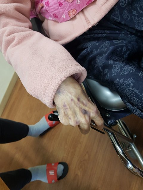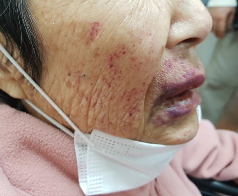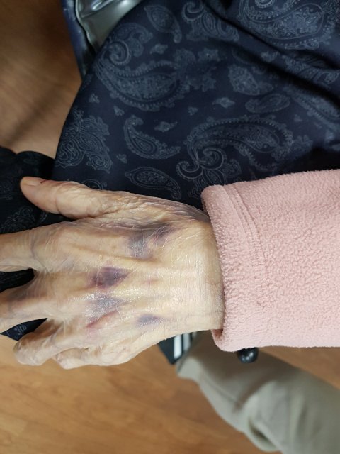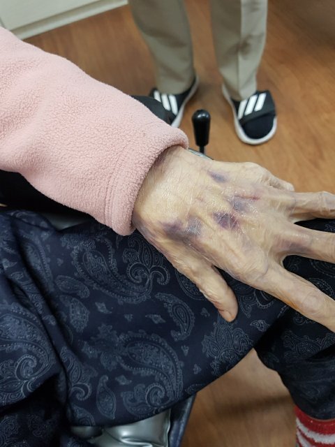 작은 아빠는 할머니의 현재 신변상태를 확인하기 위해 2022년 3월 6일에 요양원을 찾아갔는데 눈 앞에 할머니의 몸 상태는 끔찍했습니다. 얼굴, 어깨, 팔, 손에 폭행 흔적으로 인한 보랏빛 멍들과, 통증으로 인해 양팔을 들지도 못하는 상태셨고, 가슴통증을 호소하며 고통스러워하고 계셨습니다. 폭행을 했던 요양보호사 팀장은 “할머니가 나에게 효자손을 휘둘러서 위협을 느꼈고 효자손을 빼앗는 과정에서 얼굴을 쳤다”라며 죄송하다는 답변만 되풀이 하였습니다.
