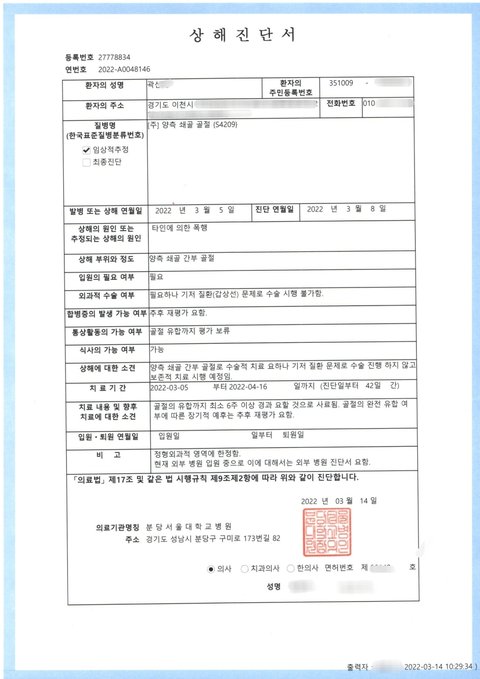 저희 아버지는 2022년 3월 7일 정밀한 진찰이 필요하다고 생각되어, 병원에 할머니를 모시고 가서 통증을 호소하는 부위만 X-RAY를 찍었는데, 요양보호사의 폭행으로 양측 어깨 쇄골이 골절된 사실을 알게 되었습니다. 검사를 했던 병원에서는 할머니가 고령으로 전신마취의 위험성 때문에 여기서는 수술을 할 수 없으니 소견서를 가지고 더 큰 병원으로 갈 것을 권유하여, 분당서울대병원 응급실에서 남은 검사를 진행하였습니다.