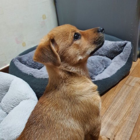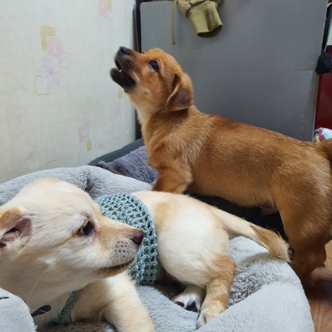 빨강 - 남아, 황구, 다리가 짧아요. 털은 꼬들꼬들해요. 배를 잘 까요.