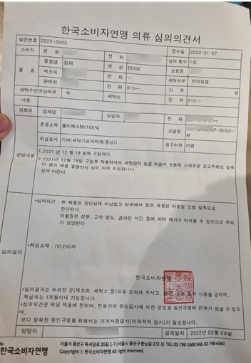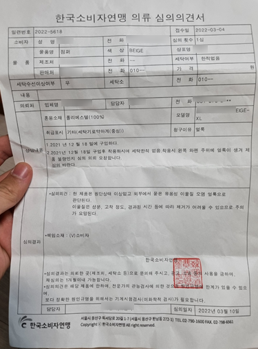 이대로 세탁을 맡기면 처음 그대로의 상태가 아니기에 재심의도 더 어려워 질 수 있다고 하여, 어차피 지워지지 않는 얼룩이니 세탁하지 않고 다시 소보원에 접수를 하라는 권유에 그렇게 해보겠다고 세탁을 하지 않고 나왔습니다.