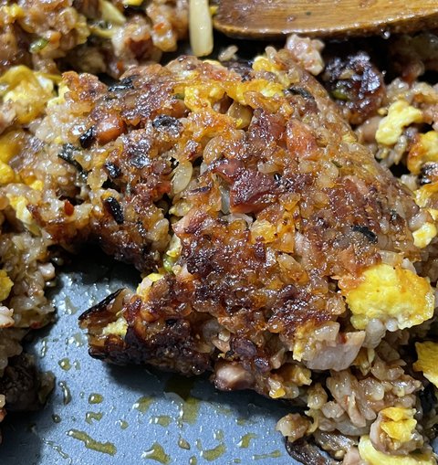 밥을 비빈 후 팬에 꾹 꾹 눌러서 살짝 태워서