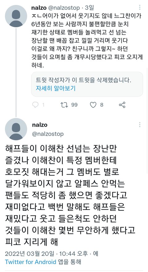 해찬이 원래 윈윈 마크 태일 너나할것없이 멤버 좀 자기맘에 들면 엄청 치대고 들러붙는 애잖아 그래서 런쥔이한테 그러는것도 귀엽다 생각하고 넘어갔음 드림 단체로 런프됐다는 말 나올정도로 다른 멤버들도 요즘 런쥔이 엄청 귀여워하고 ..(특히 마크) 그래서 걍 이번 해찬픽은 런지니구나 ㅋㅋ 하고 넘겼는데 요즘은 유독 심한듯 … 걍 먹금만 하고 넘어갈 문제인가 싶다 이게 ㅎㅎ.. 정확히 본인이 서치 해보고 동런 잘 먹히니깐 알페스로 소비되기를 원하고 하는 것 같은데 이용당하는 런진이 입장은 어떨까 싶음 물론 런쥔이도 ㅋㅋ.. 가끔 맞춰주는건지 본인이 나서는건지 모를정도로 알페스스러운 행동을 하긴 하는데 ㅋㅋ .. 에휴 모르것다