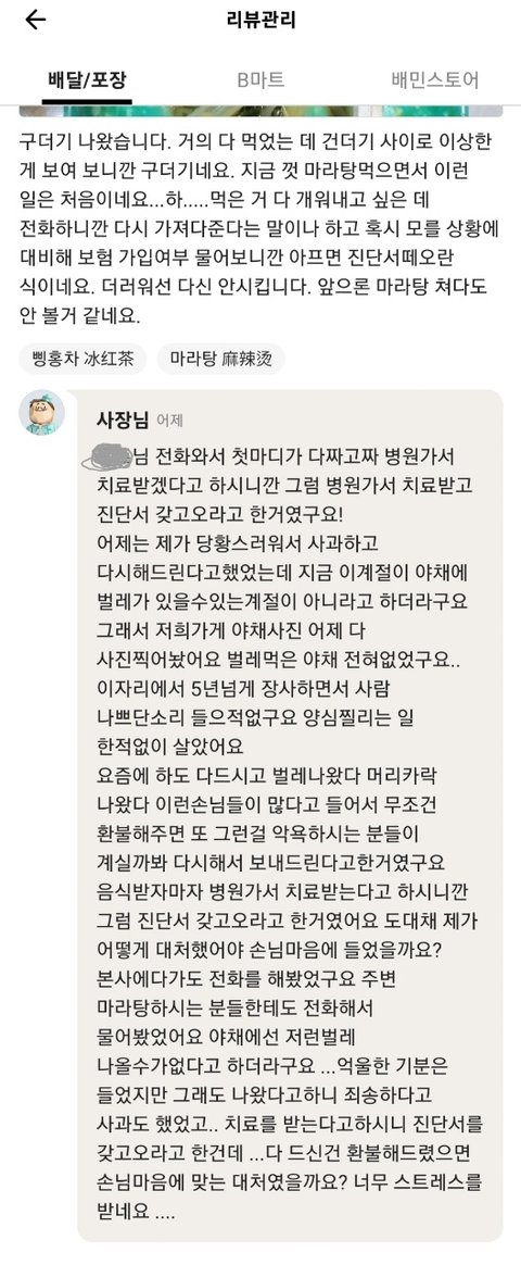 제가 고의로 벌레를 넣고 진상부린다는 생각하시는 것 같았습니다.