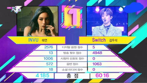 태연 invu가 엠카 1관왕 음중 4주연속 1위 인가 트크인데 뮤뱅만 못먹고 이번주도 여자아이들이 유일하게 못먹을 음방,,,ㅋㅋ