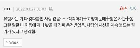 와 댓글중에 이거 공감돼서 캡쳐함 제니는 유행을 다갖다붙인 얼굴임 동그란얼굴 짧은하관 고양이상 직각어깨ㅋㅋㅋㅋ