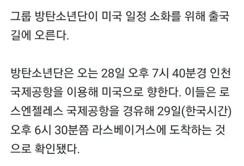 [단독] 방탄소년단 28일 출국