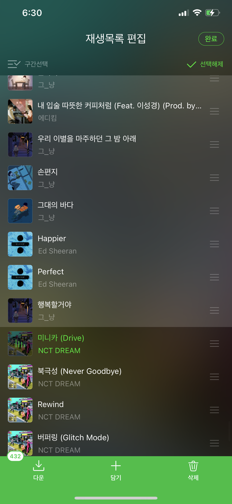 원래 재생목록에 잇던 노래들 싹다 빠이.......