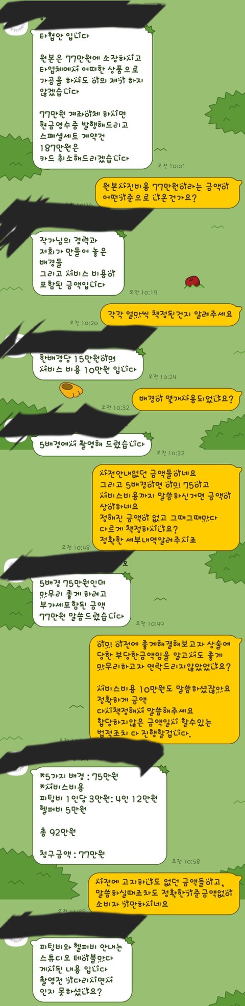 제가 소보원접수하고 카드사에 항변권 신청하니 원본비용으로 77만원을 받겠다고 제시하길래 세부내역 요구하니 금액이 상이하고 그냥 부르는게 값?이라는 느낌을 받아서 타협안 받아들이지않았구요...