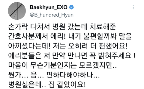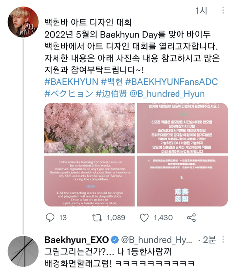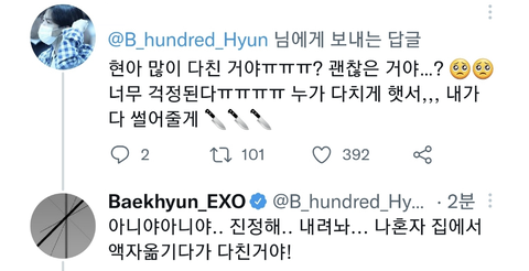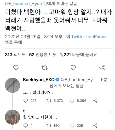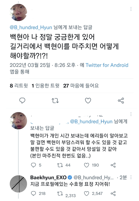 은 바로 트위터로 팬들한테 답멘한 엑소 백현