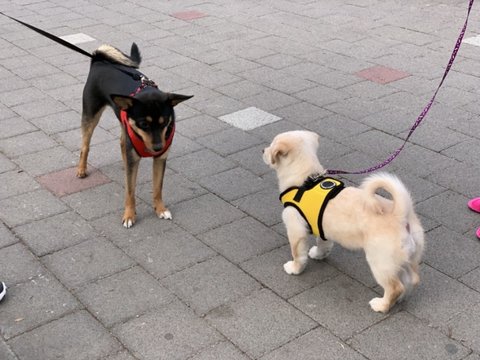 덩치는 비슷하지만 언니나 오빠일 강아지와 인사도 하구요.