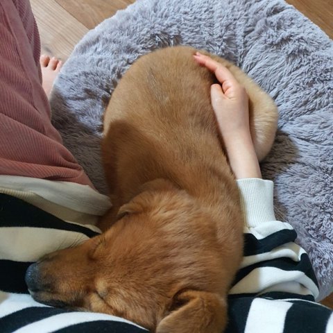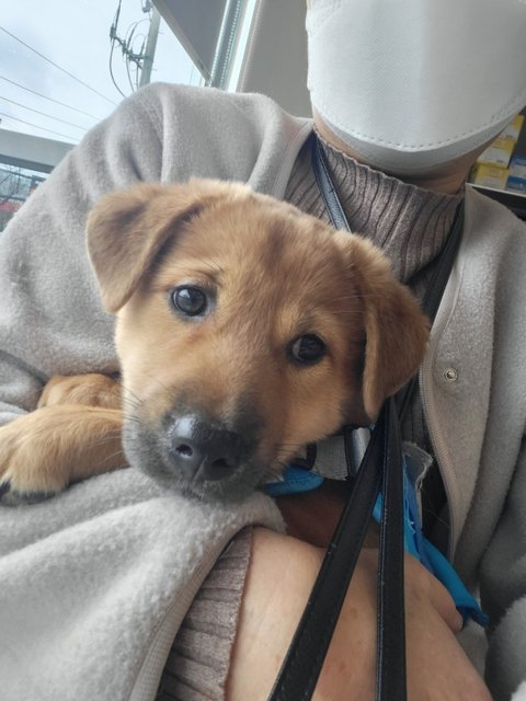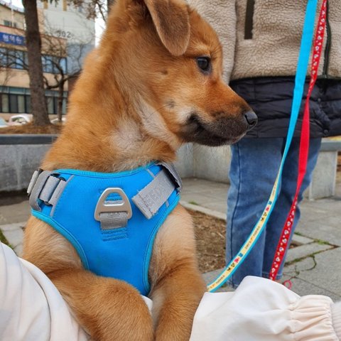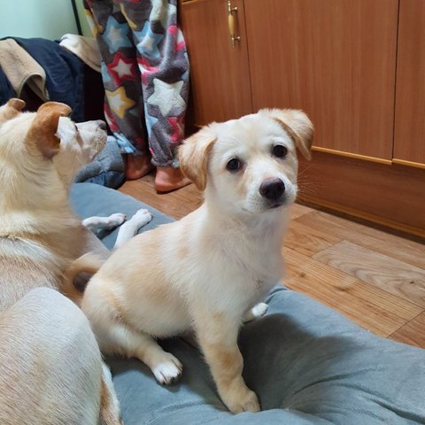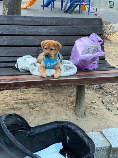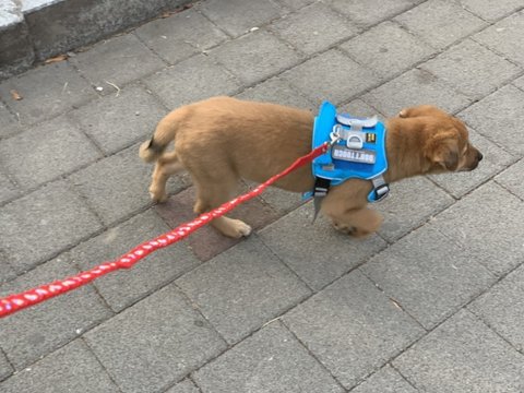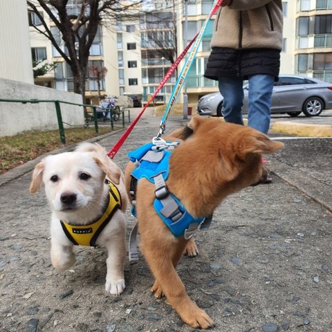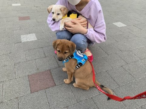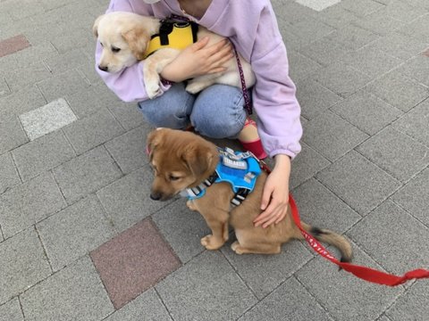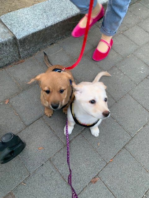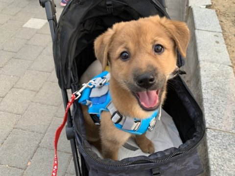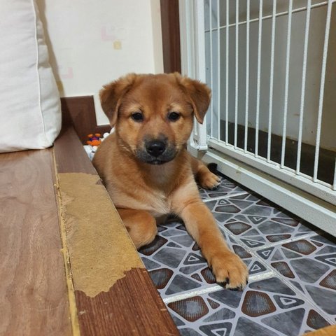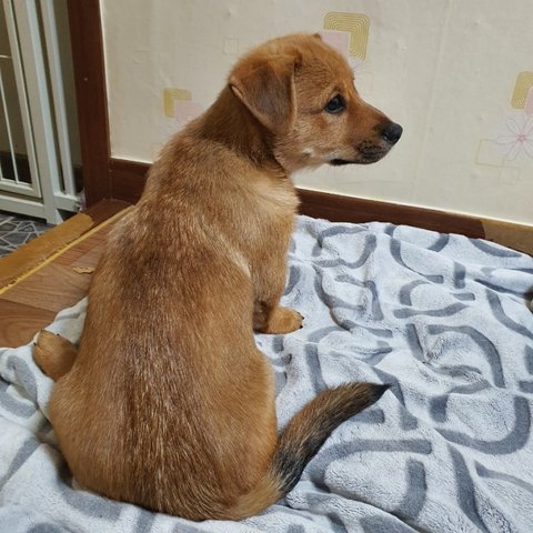 빨강 - 남아, 황구, 다리가 짧아요. 털은 꼬들꼬들해요. 배를 잘 까요. 소심해요.