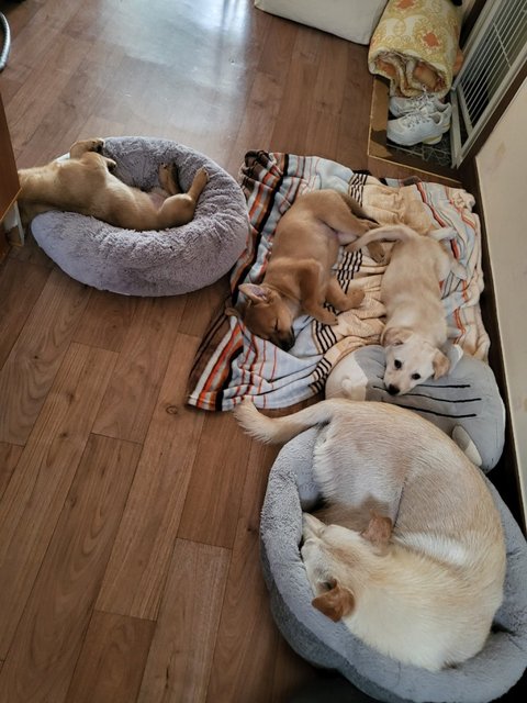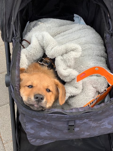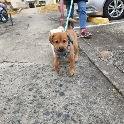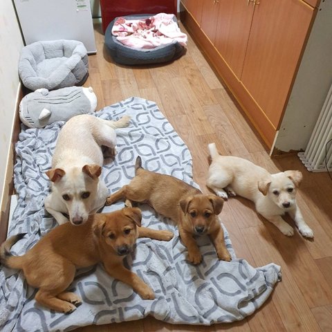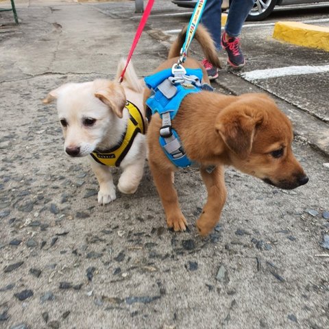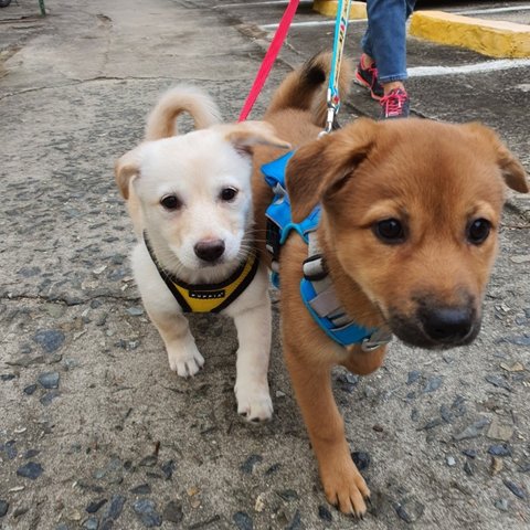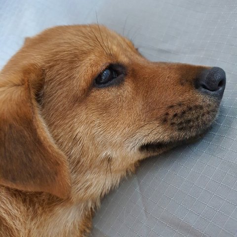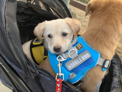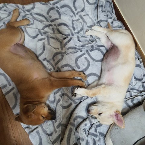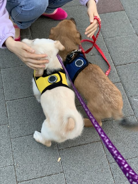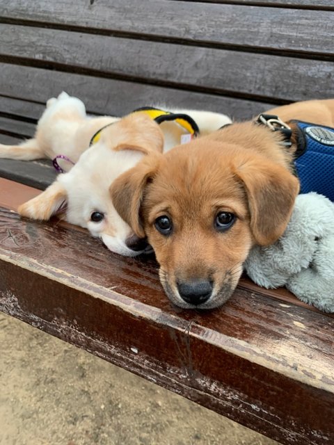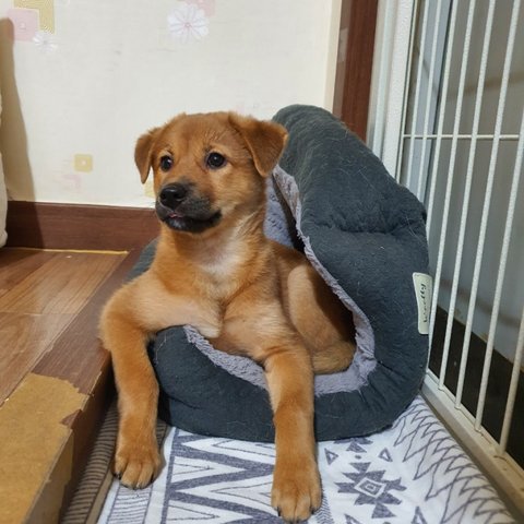 빨강 - 남아, 황구, 다리가 짧아요. 털은 꼬들꼬들해요. 배를 잘 까요. 소심해요.