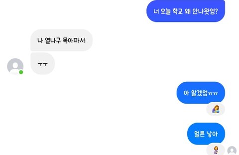 쨋던 걔가 오늘 안나와서 기회다 이라고 생각하고 페메 보내봤는디 빨리 나아를 ㅂㅅ같이 오타로 낳아 ㅇㅈㄹ함 아니 나 진짜 아는데ㅠㅠ