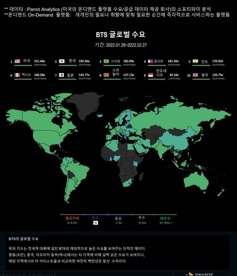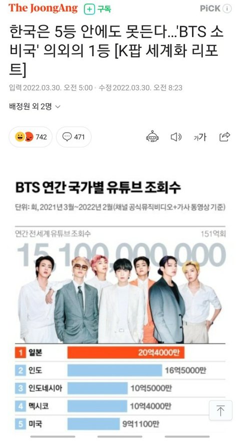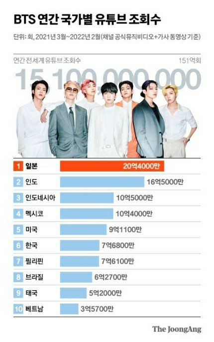 방탄 20억 뭐냐 ㅋㅋㅋㅋ 한국은 6위인데도 7억이네