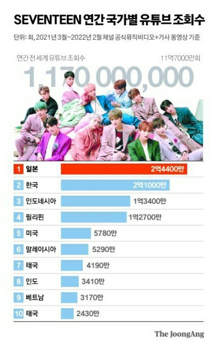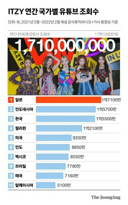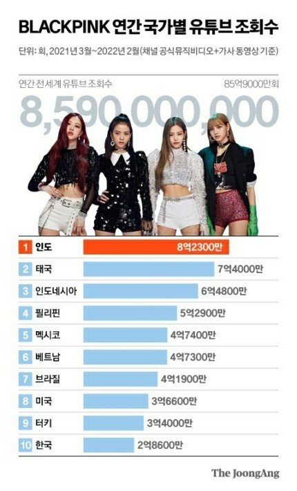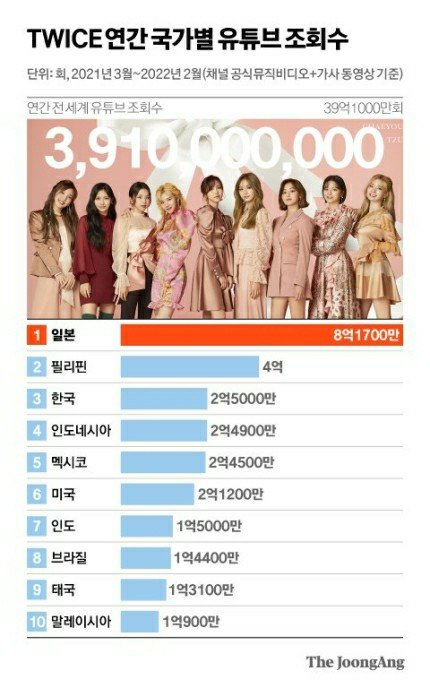 공식뮤비는 신곡이 엄청유리할수밖없고 블핑 마지막뮤비가 20년 10월2일인데 집계는 21년 3월..5달이나 지난후부터 기록임에도 저정도면 걍 천상계인데...동남아염불;;미국도 3억7천이야 공식뮤비 꼴랑 10곡도 안되는걸로 ㅈㄴ선방이구만