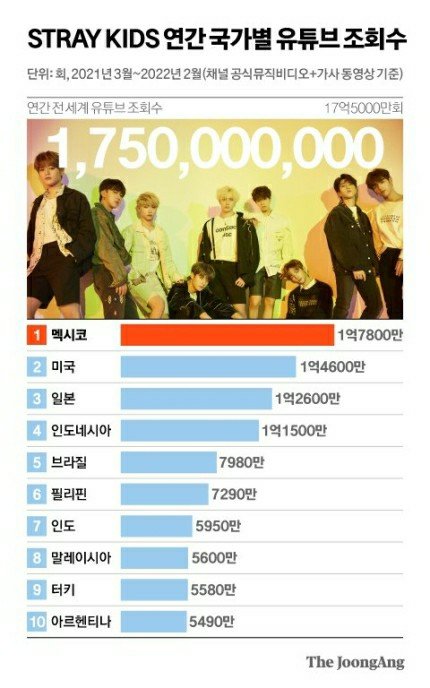연간 국가별 유튜브 조회수(방탄,블핑,트와이스,세븐틴,아이유,에스파,스트레이키즈)