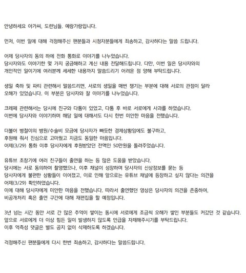 이게 해명할 일인가 이렇게 개인적인 일을...ㅋㅋㅋㅋㅋㅋㅋ 친구들끼리 이런 오해 정도야 생길 수 있는 거 아닌가 애초에 쌓인게 있으면 손절할 때 다 풀거나 나중에 사적으로 말해야지... 이렇게 난리날 거 알았으면서 왜 방송에서 a부터 z까지 다 말했담