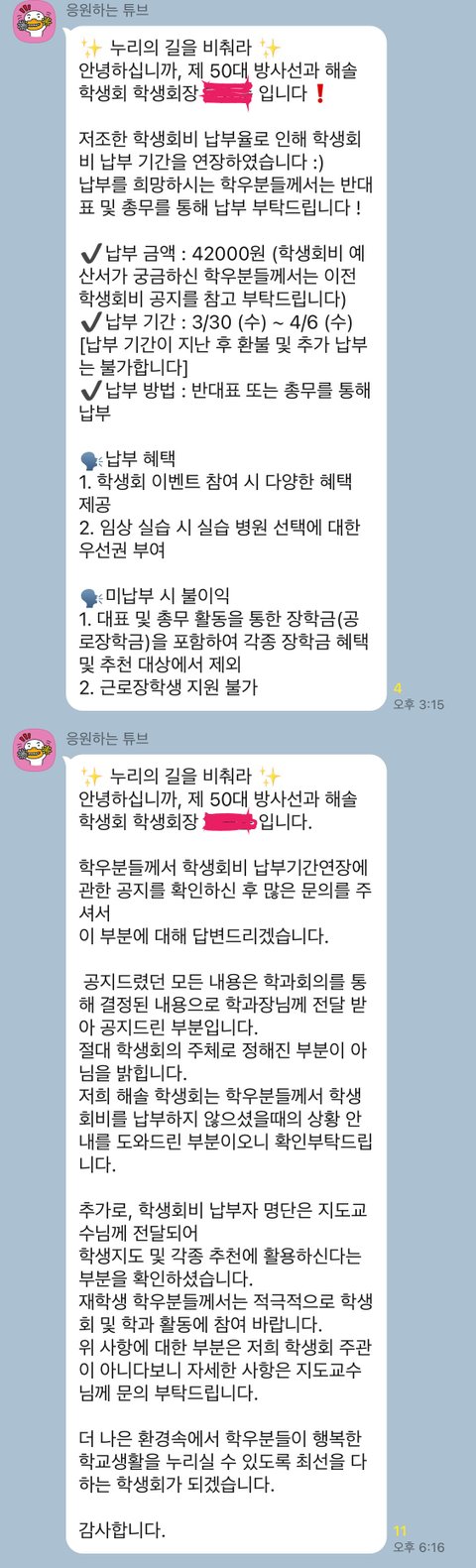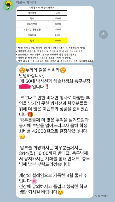 사건의 시작은 새학기에 그렇듯이 단톡방에 올라오는 학생회비 납부하라는 장문의 카톡이었음.
