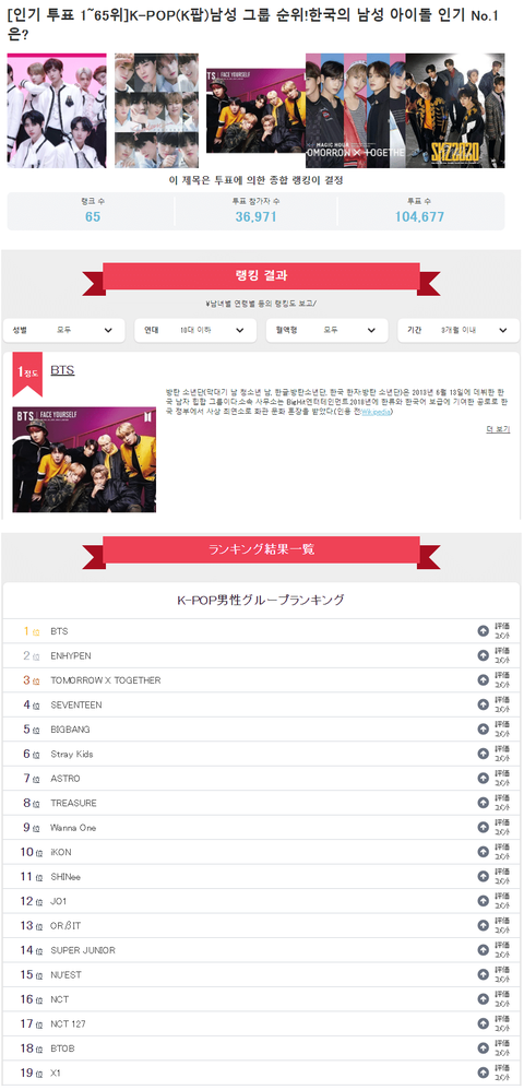 2022년 일본 남녀 10대연령대가 투표한 가장 좋아하는 케이팝 남그룹 순위(최근 3개월내)