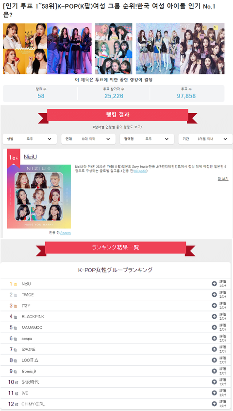 2022년 일본 남녀 10대연령대가 투표한 가장 좋아하는 케이팝 여그룹 순위(최근 3개월내)