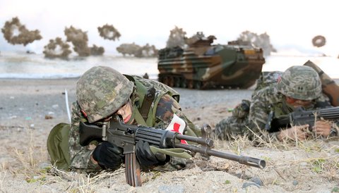 (사진 설명) 경북 포항에서 열린 2014년 호국 합동상륙훈련에서 해병대원이 해안에 성공적으로 상륙하는 훈련을 하고 있다. 연합뉴스